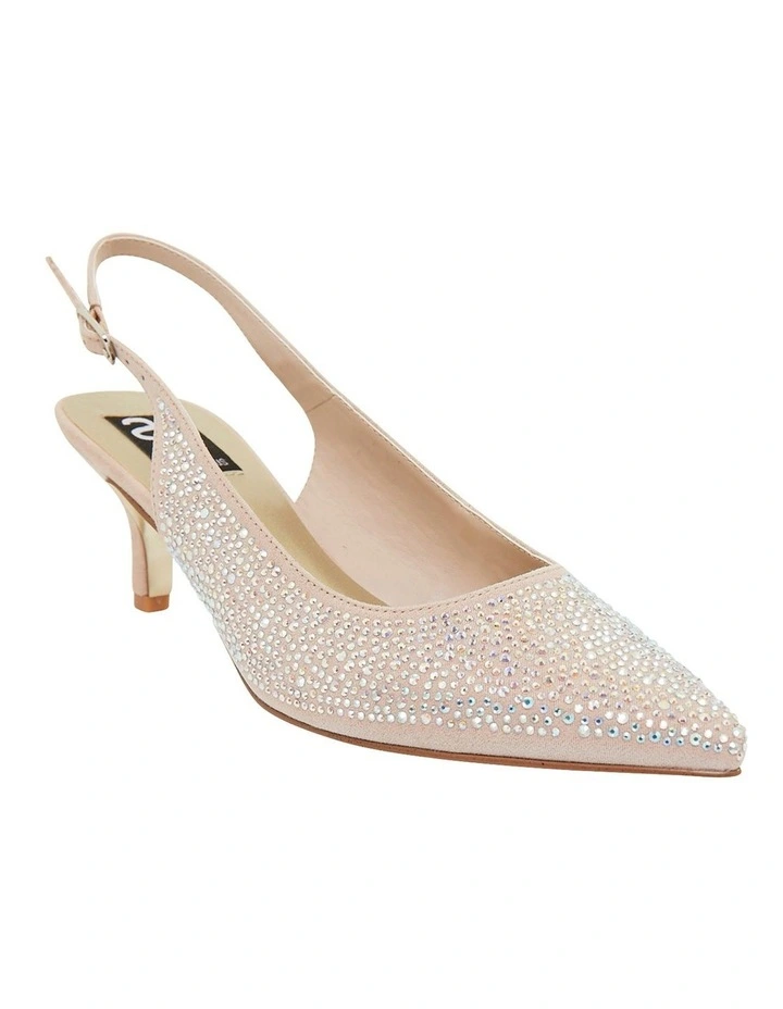 Dazzle on the dance floor with Teagan. This sleek kitten heel pump is adorned with embellishments, an adjustable sling back strap and on-trend pointed toe heel.
