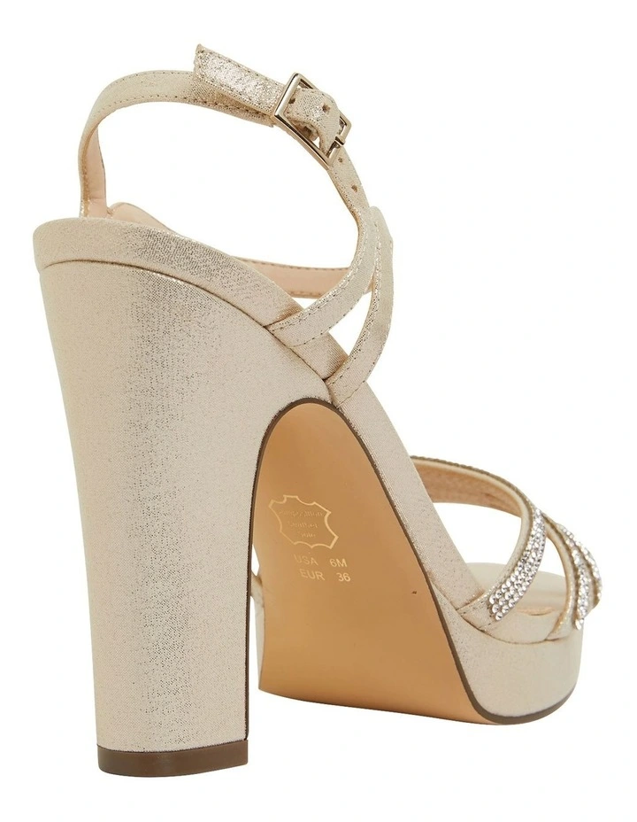 Drawing inspiration from disco-style glamour, SARALYN adds an understated yet elegant touch to evening looks.Β The slender toe straps are adorned with crystals and a complimenting buckled ankle fastening, then set on a towering thick heel and platform sole. Accentuate the slight sparkle by wearing this against muted tones.