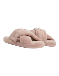 Luxe lounging beckons with these soft slippers featuring an elegant crossover strap for a touch of cosy chic.